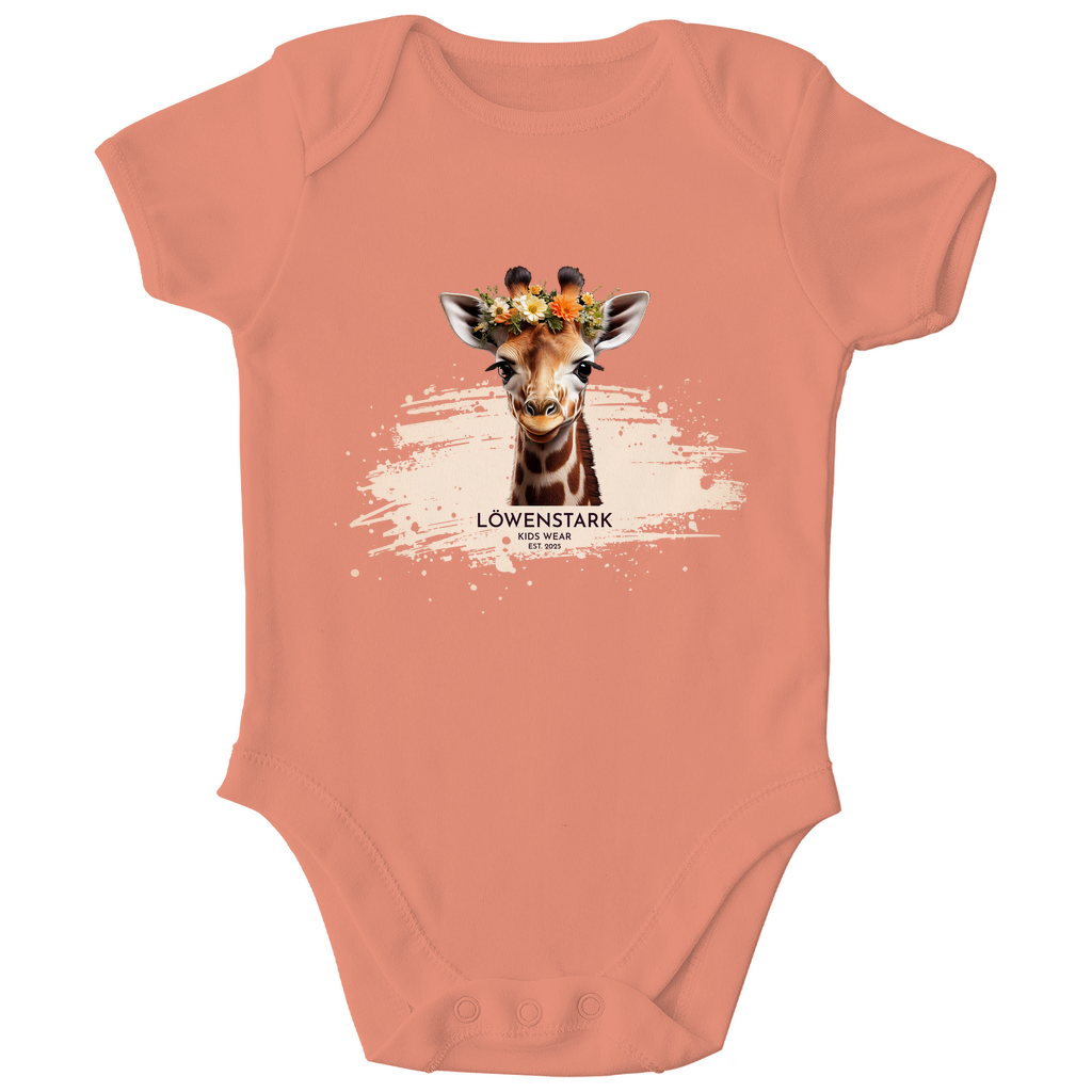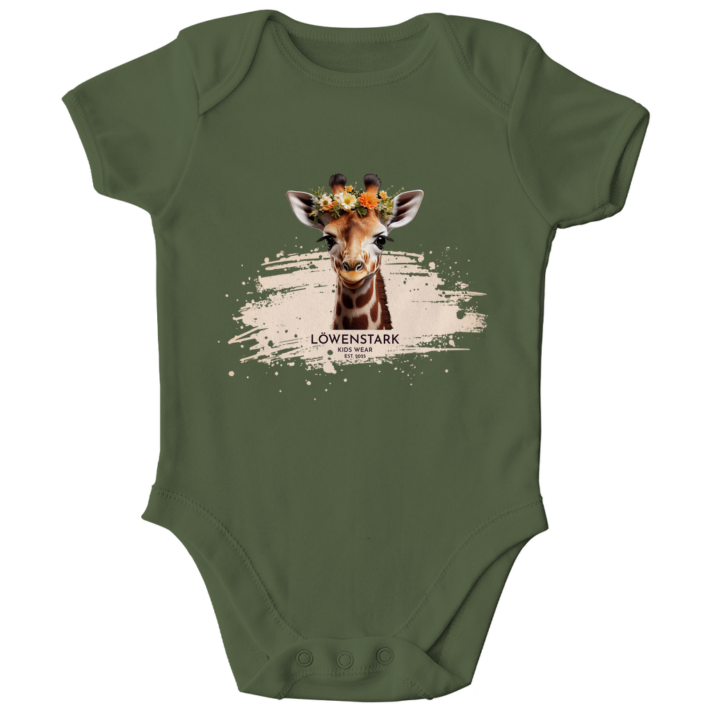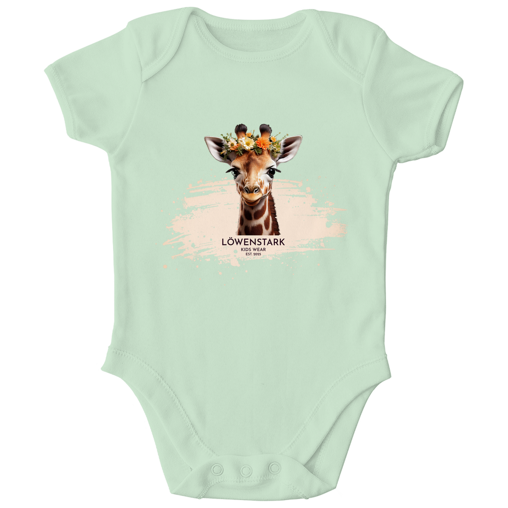 Mit ihrem liebevollen Blumenkranz und dem freundlichen Blick bringt unsere Giraffe aus der Wild & Wundervoll Kollektion ganz viel Herz auf diesen Babybody. Ein Design, das für Entdeckergeist, Sanftmut und kindliche Neugier steht – perfekt für kleine Persönlichkeiten, die schon jetzt ganz groß träumen.